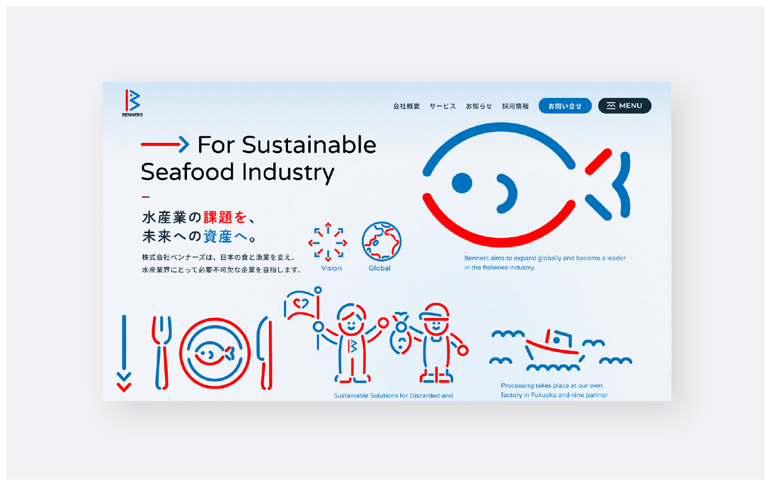 ベンナーズは、日本の食と漁業を守るという社会的意義の高い事業を展開しながら、グローバル市場への進出も視野に入れています。水産業界から「最も必要とされる会社」を目指す中で、事業内容や企業としての姿勢を、より多くの人に直感的に伝える必要がありました。