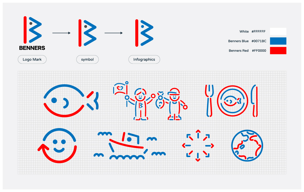ベンナーズのコーポレートロゴは、赤と青のトリコロールカラーで構成されています。このロゴの正解感とインフォグラフィックを掛け合わせたイラストをビジュアルの軸としてWebサイト全体へと展開しています。
